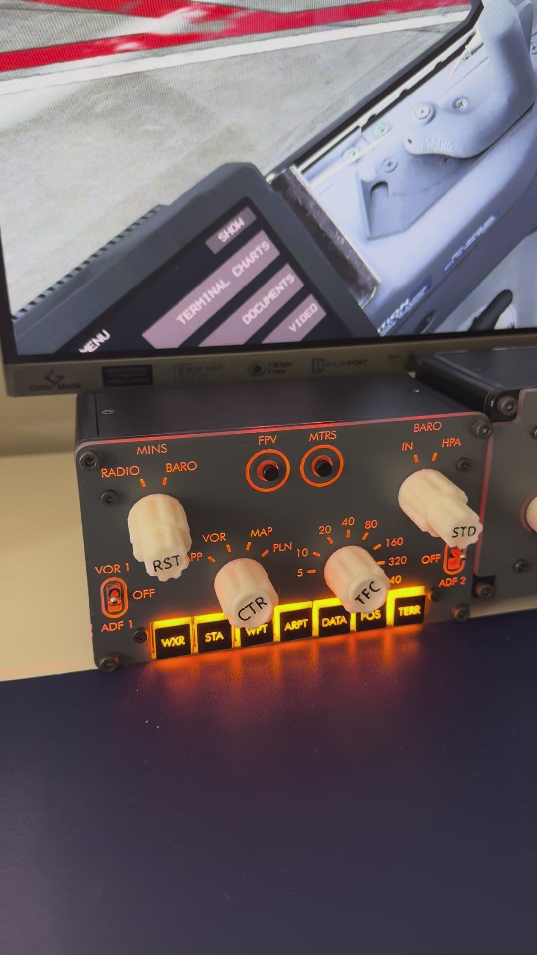 You can manage your flight with all buttons on the module. MINS, BARO, RADIO, RST, STD, MODE, RANGE, TFC, CTR all buttons are active. The module is compatible with PMDG Boeing 737-800/900 NGX/U in all PREPAR3d v4+, v5+, v6+, Microsoft Flight Simulator (MSFS) Steam Edition, MS Store Edition simulators and ZIBO MODE in Xplane simulators.